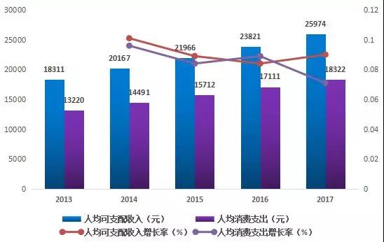 2013-2017年中國居民人均可支配收入和消費支出