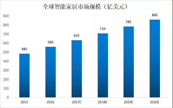 根據(jù)GFK統(tǒng)計,全球智能家居市場規(guī)模在2015年達485億美元,隨后增速逐漸趨緩,預計仍然維持每年約80億美元的增速。預計2018年市場規(guī)模將達到710億美元。