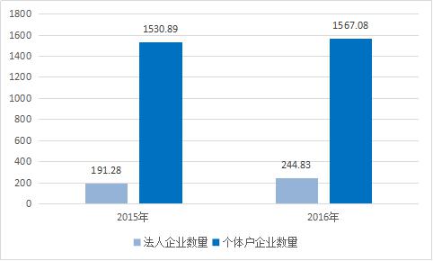截至2016年底我國零售業(yè)經(jīng)營單位共有1811.91萬個,同比增長5.2%。其中,法人企業(yè)單位數(shù)量為244.83萬個,同比增長28%,占全部經(jīng)營單位比重為13.5%,比上年提升2.4個百分點;個體工商戶數(shù)量1567.08萬個,同比增長2.4%,占全部經(jīng)營單位比重為86.5%。