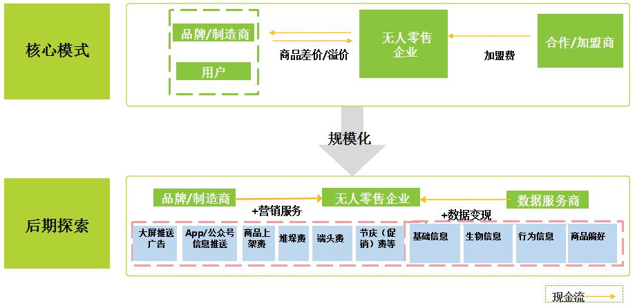 無人零售企業(yè)收入來源以銷售商品賺取差價為主,并且通過規(guī)?;岣咦h價能力降低采購成本。此外,從加盟商獲取加盟費用的商業(yè)模式也已經(jīng)開始推行。無人零售發(fā)展至中后期,企業(yè)數(shù)據(jù)更為龐大,其盈利模式將隨之產生更多的想象空間,以互聯(lián)網(wǎng)思路開展營銷服務、數(shù)據(jù)變現(xiàn)等都是比較成熟的可參考模式。
