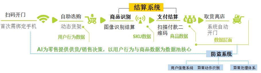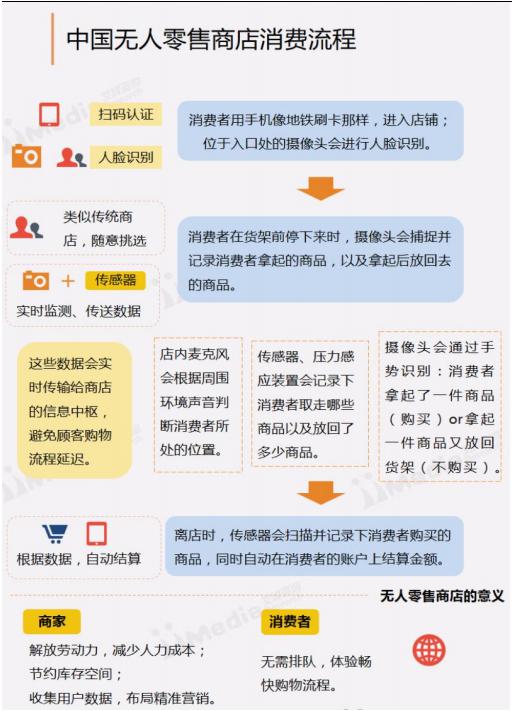 國內目前的無人零售店的消費流程主要分為:掃碼認證或人臉識別、挑選商品、根據(jù)數(shù)據(jù)自動結算這些環(huán)節(jié)。對于商家而言,可以節(jié)約人力成本和沉淀消費數(shù)據(jù),對于消費者而言,則可以增強體驗感和減少排隊時間。