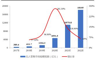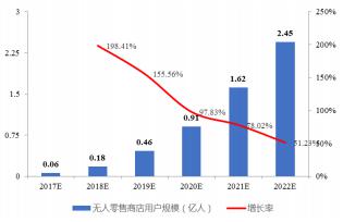 據(jù)艾媒咨詢預測,2017年我國無人零售商店交易額預計為389.4 億元,未來五年無人零售商店將會迎來發(fā)展紅利期,2020年的預計增長率可達281.3%,至2022年市場交易規(guī)模將超過1.8萬億元。同時,艾媒咨詢預計,2017年我國無人零售商店的用戶規(guī)模僅為600萬人,未來五年用戶規(guī)模將大幅增長,至2022年可達2.45億人。