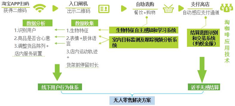 2017年7月阿里巴巴在淘寶造物節(jié)上推出無人便利店淘咖啡。淘咖啡經(jīng)營面積約200平米,分成超市區(qū)(無店員)和餐飲點單區(qū)(有少量店員),可一次性容納客流50人左右。消費者通過手機淘寶 APP 掃碼進店,選購完成后需通過兩道結算門,當?shù)谝坏篱T感應到消費者的離店需求時即會開啟,消費者走出第一道門后,系統(tǒng)會自動對所購買商品進行識別與結算,結算完成后第二道門自動打開,消費者離店。