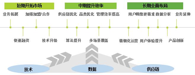 中期:企業(yè)的運營重點在于供應鏈與管理效率的提升,包括企業(yè)進行技術算法提升,并將供應鏈進行網(wǎng)狀轉變,同時擴充或開發(fā)零售多場景,覆蓋主要消費場景,品類、商品組合進入精選模式,根據(jù)不同用戶個性化/精準化推送等。