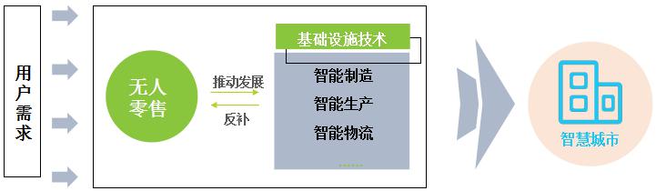 以無人店和開放貨架為代表的無人零售市場雖然才剛剛開始,在政策不斷規(guī)范并且進一步鼓勵無人零售業(yè)態(tài)發(fā)展的環(huán)境和數(shù)據(jù)、技術、供應鏈等多環(huán)節(jié)共同促進下的情況下,無人零售市場三大業(yè)態(tài)相互配合且與傳統(tǒng)業(yè)態(tài)緊密融合。無人零售用戶消費習慣將逐漸被培養(yǎng)成熟并且倒逼傳統(tǒng)市場不斷改革(降本增效、提升體驗),無人零售帶動智能制造、智能物流等基礎設施技術不斷發(fā)展突破,無人便利店,無人倉庫,無人機等之間相互配合,全鏈條智能化空間進一步提升。這些技術的突破又將反補無人零售行業(yè)的發(fā)展,人們生活便捷度進一步提升,成為推動智慧城市發(fā)展的要素之一。