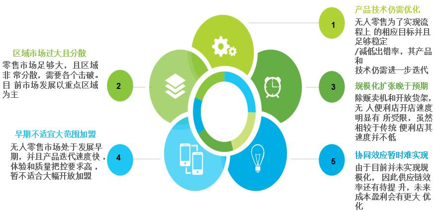 無人零售市場整體看好,但發(fā)展仍受到一定困阻典型優(yōu)質企業(yè)能夠起到很好的示范作用,整體無人零售市場有發(fā)展前景。但目前來看,不容忽視的是市場剛剛經(jīng)歷一年左右的發(fā)展,還處于前期探索階段,因此還存在一些比較共性的發(fā)展困阻,主要集中在產品技術優(yōu)化、區(qū)域市場拓展、企業(yè)規(guī)?;l(fā)展、企業(yè)開放加盟和供應鏈的協(xié)同效應。